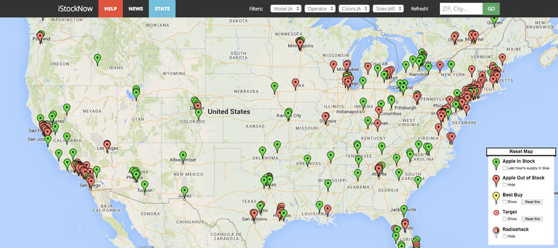 O site iStockNow é especialista em inventário da Apple, sempre com novidades sobre as lojas da Apple que tem os produtos que você deseja comprar. Para este lançamento do iPhone 6 e iPhone 6 Plus, eles criaram um site especial que mostra, em tempo real, o estoque de cada celular e de cada loja. Além disto, é possível utilizar os filtros no topo do site para escolher o modelo, a cor, a capacidade e a operadora. No caso dos brasileiros, basta escolher a operadora "Unlocked" que ele atualizará e mostrará quais as lojas que possuem o aparelho. Também é possível inserir o CEP (Zip Code) do lugar aonde você está nos EUA para ver apenas as lojas próximas. Para quem está indo, é uma boa ficar de olho neste site para ver qual a loja que tem a maior disponibilidade do modelo de iPhone que você deseja.